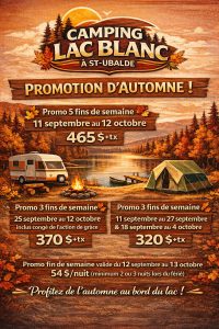 Promo fin de semaine Valide du 12 septembre au 13 octobre pour 54,00$ /nuit (minimum 2 ou 3 nuits lors du férié) (ne peut se prévaloir de l’équipement en place entre deux réservations. Une charge de semaine avant promo peut être appliqué)